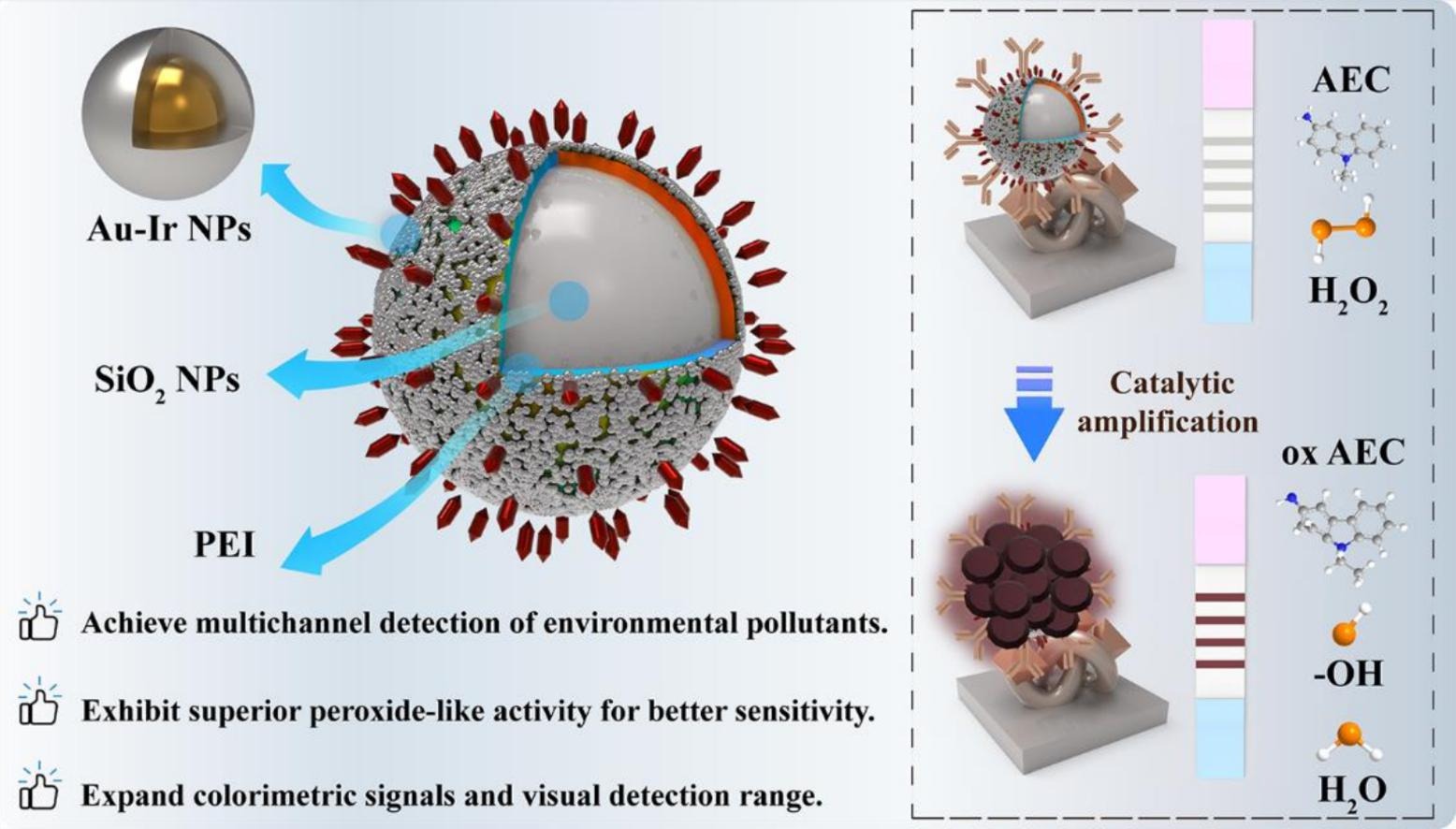 為解決這一難題,研究團(tuán)隊(duì)開發(fā)了一種基于雙金屬?gòu)?fù)合納米酶標(biāo)簽(Si@Au/Ir)的新型免疫層析快檢試紙條。Si@Au/Ir標(biāo)簽以硅球?yàn)閮?nèi)核,其表面吸附了大量金核銥殼納米衛(wèi)星。這種雙金屬?gòu)?fù)合結(jié)構(gòu)不僅賦予試紙條對(duì)重金屬離子、抗生素及非法添加劑較高的親和性和穩(wěn)定性,還展示出卓越的過(guò)氧化物酶樣(POD)催化活性,從而有效放大檢測(cè)信號(hào)。