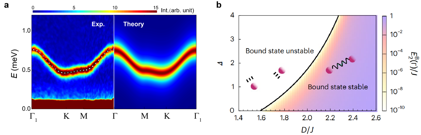 圖1. a非彈性中子散射觀測到沿著高對稱方向的自旋波(T=60mK,B=5T)以及利用自旋波理論對中子散射數據的擬合。b通過理論計算得到的三角晶格自旋S=1模型中雙磁振子束縛態的穩定區間。橫軸與縱軸分別是單離子各向異性與交換各向異性的強度