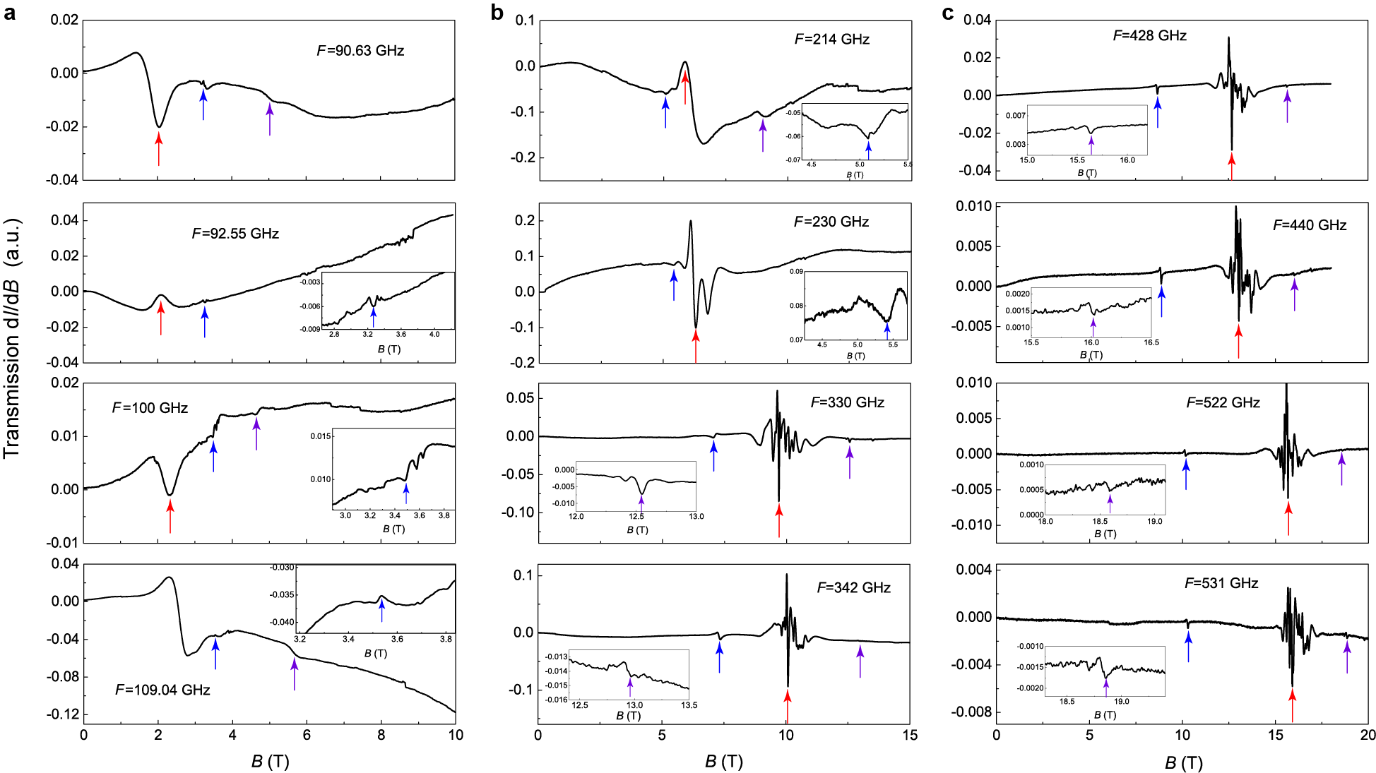圖2. SHMFF測量得到的 ESR 譜 (T=2K),磁場方向與 ?? 軸傾斜 6?。紅色、藍色和紫色箭頭標記的信號分別表示 Γ 點的單磁振子激發、Γ 點的雙磁振子束縛態,以及從單磁振子態到 K 點雙磁子束縛態的有限溫度激發