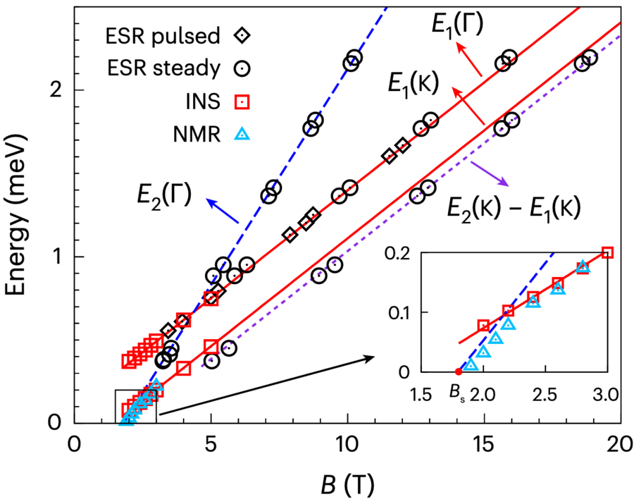 近日,穩態強磁場實驗裝置(SHMFF)用戶南方科技大學吳留鎖、梅佳偉團隊與浙江大學汪臻濤、中國人民大學于偉強、澳大利亞核子科學與技術組織(ANSTO)于德洪等國內外學者合作,利用SHMFF 所屬多頻高場電子自旋共振譜儀(MFHF ESR),在三角晶格自旋阻挫量子磁性材料Na?BaNi(PO?)?的研究中取得了重要突破,首次直接觀測到雙磁振子束縛態的玻色-愛因斯坦凝聚。相關研究成果發表在國際期刊Nature Materials上。
