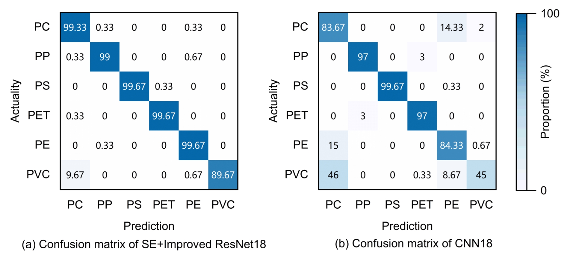 安光所團隊成員王貴師研究員、陳家金副研究員和黃威翔碩士研究生等人,提出了一種改進的殘差網絡模型,可對激光功率不足和光譜采集時間較短的非理想實驗條件下測得的微塑料不同質量拉曼光譜進行分類識別。相比傳統的卷積神經網絡,引入擠壓-激發(SE)模塊的改進的殘差網絡能夠以不顯著增加參數量和計算量情況下,在噪聲干擾大、信噪比低的低質量微塑料拉曼光譜分類中達到更高的準確率,并且通過Grad-CAM可視化反映了機器學習進行光譜分類的依據。這項工作表明了機器學習在更多復雜環境和干擾下,分析處理低質量拉曼光譜的能力。