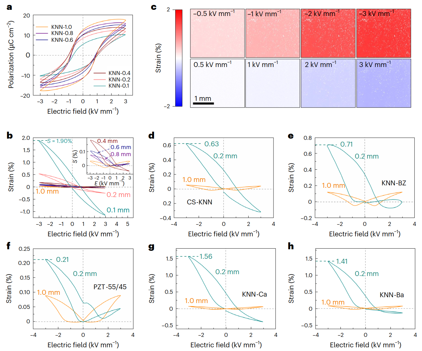 清華大學(xué)材料學(xué)院及合作團(tuán)隊(duì)以熱壓燒結(jié)并經(jīng)退火處理的KNN陶瓷為研究對象,展示了電致應(yīng)變響應(yīng)與陶瓷材料厚度的特殊依賴關(guān)系,并實(shí)現(xiàn)了1.9%的超高電致應(yīng)變(在室溫、3kV/mm、1Hz條件下,壓電常數(shù)超過6300pm/V),相比傳統(tǒng)KNN陶瓷提升了近50倍。通過多種原位測試表征手段,證實(shí)了該電致應(yīng)變在面內(nèi)分布較為均勻,且在小于3kV/mm的電場下,其主要貢獻(xiàn)并非幾何彎曲(如圖1所示)。隨著KNN陶瓷厚度降低,電致應(yīng)變顯著增加,并表現(xiàn)出電場下的非對稱行為,這一現(xiàn)象也存在于其他壓電陶瓷體系中(如圖1)。