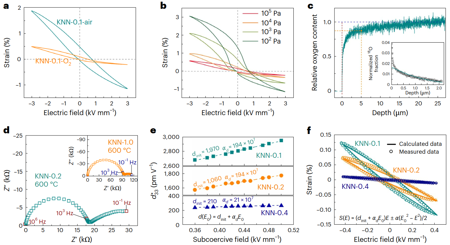 該研究驗(yàn)證了KNN壓電陶瓷中氧空位的非均勻分布,闡釋了氧空位短程遷移機(jī)制,為壓電陶瓷及其他氧化物材料的缺陷-性能關(guān)系提供了新的分析視角。此外,該KNN壓電陶瓷還展現(xiàn)出良好的頻率和溫度穩(wěn)定性以及抗疲勞性能,具有通過疊層技術(shù)實(shí)現(xiàn)在壓電多層驅(qū)動器中應(yīng)用的潛力,對智能材料、柔性電子、微納驅(qū)動等領(lǐng)域的研究具有重要指導(dǎo)意義。