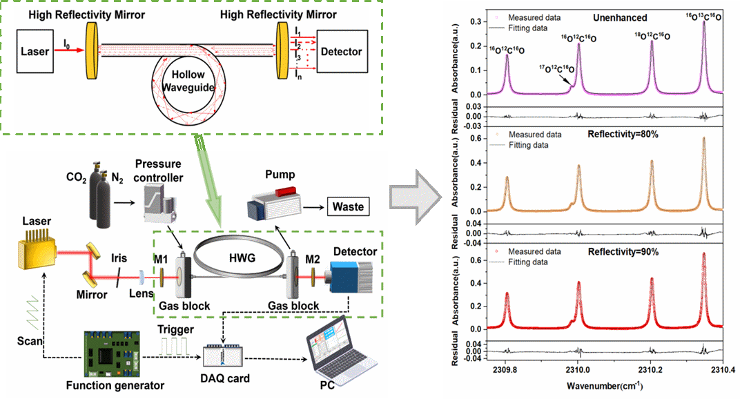 近年來,空芯光波導(Hollow Waveguide,HWG)作為一種新型的氣體吸收池,具有光程體積比大、光路布置靈活穩定、成本較低等優勢,廣泛應用于光譜測量領域,在多個方面相較于傳統多次反射型光程池具有明顯優勢。但是常規空芯光波導一般采用直通單路式測量,其光程取決于所使用的空芯光波導長度,極大的限制了其靈敏度和檢測極限的提升。