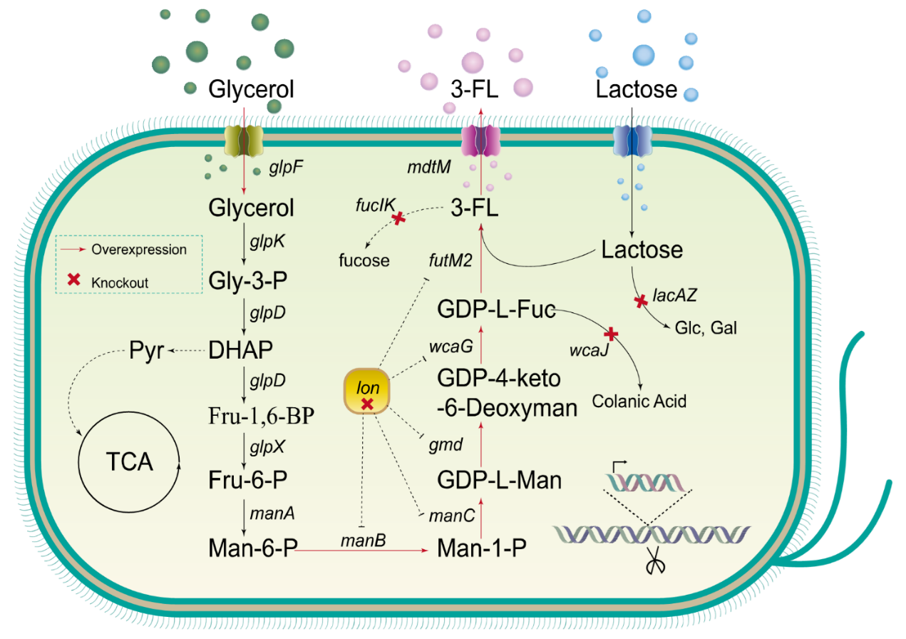3-巖藻糖乳糖是母乳低聚糖的重要組成成分,對嬰兒健康具有不可替代的重要作用。然而,由于從母乳中直接提取3-FL難度極大,其生物合成一直是科研領域的熱點和難點問題。在本研究中,科研團隊以大腸桿菌BL21 Star (DE3)為宿主,通過多策略優化,成功構建了一株能夠高效合成3-FL的工程菌株,其在5 L生物反應器中發酵生產的3-FL產量高達60.24 g/L,創下目前報道的最高水平。