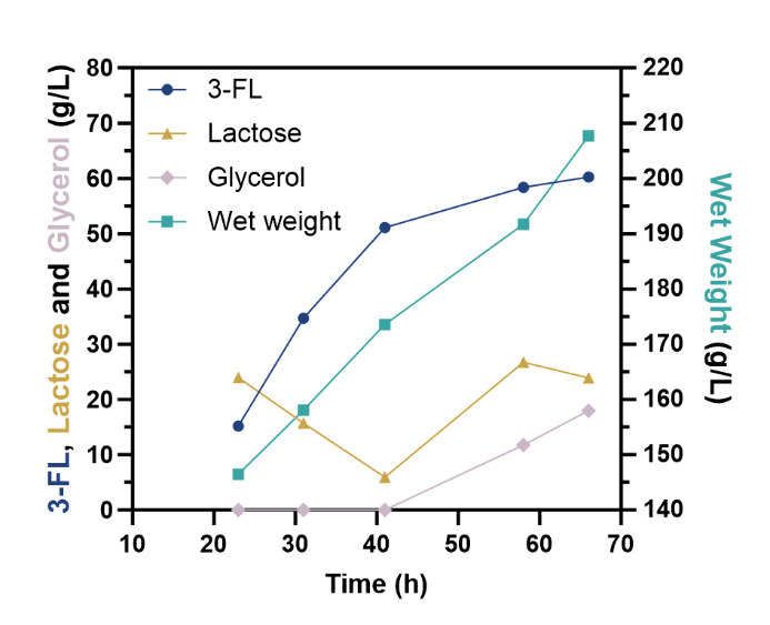 研究團隊首先將3-FL生產模塊整合到大腸桿菌中,并篩選出高效的α-1,3-巖藻糖轉移酶。隨后,通過優化前體合成基因簇和轉移酶基因的整合位點,篩選出能夠增強3-FL生產的轉運蛋白和甘油利用基因。經過一系列的基因工程改造和發酵條件優化,最終獲得了高產3-FL的菌株3FL05-1。在搖瓶發酵中,該菌株的3-FL產量達到了11.26 g/L,而在5L生物反應器中進一步放大生產時,3-FL產量更是達到了60.24 g/L,乳糖轉化率達到68%,產率為0.19 g/L/h。