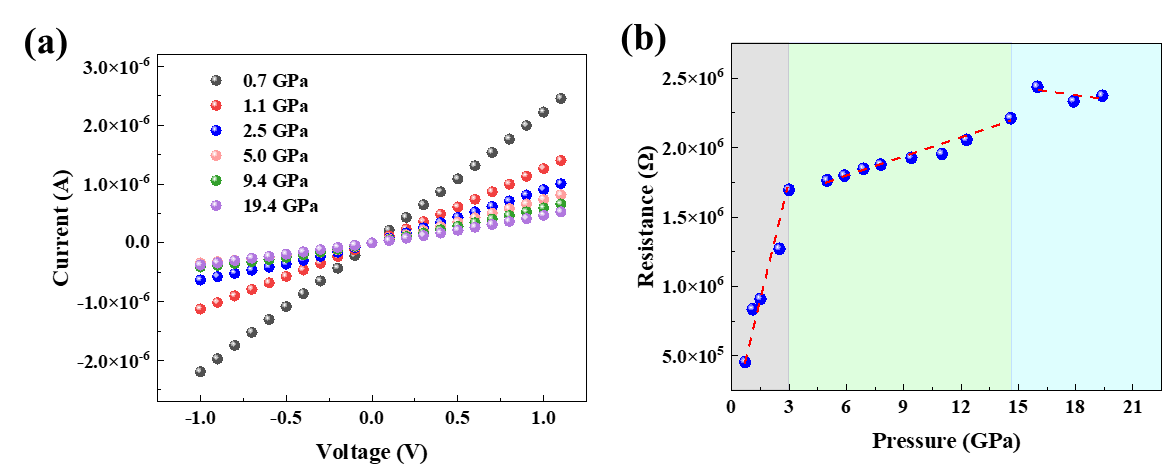 圖2.?摻雜5%Y-HfO2在高壓下的I-V曲線(a) ,電阻隨壓力的變化(b)。