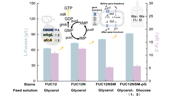 研究團(tuán)隊(duì)通過代謝工程手段,對(duì)大腸桿菌的代謝通路進(jìn)行了系統(tǒng)優(yōu)化。首先篩選并整合了關(guān)鍵酶基因,包括α1,2-巖藻糖基轉(zhuǎn)移酶和α-L-巖藻糖苷酶,將代謝通量導(dǎo)向L-巖藻糖合成。通過優(yōu)化基因拷貝數(shù),顯著提高了酶的表達(dá)水平,進(jìn)而提升了L-巖藻糖的產(chǎn)量。此外,團(tuán)隊(duì)還通過增強(qiáng)GTP和NADPH的供應(yīng),優(yōu)化了代謝調(diào)控機(jī)制,并對(duì)2'-巖藻糖基乳糖轉(zhuǎn)運(yùn)蛋白進(jìn)行改造,減少了2'-巖藻糖基乳糖的積累,進(jìn)一步提高了L-巖藻糖的生產(chǎn)效率。