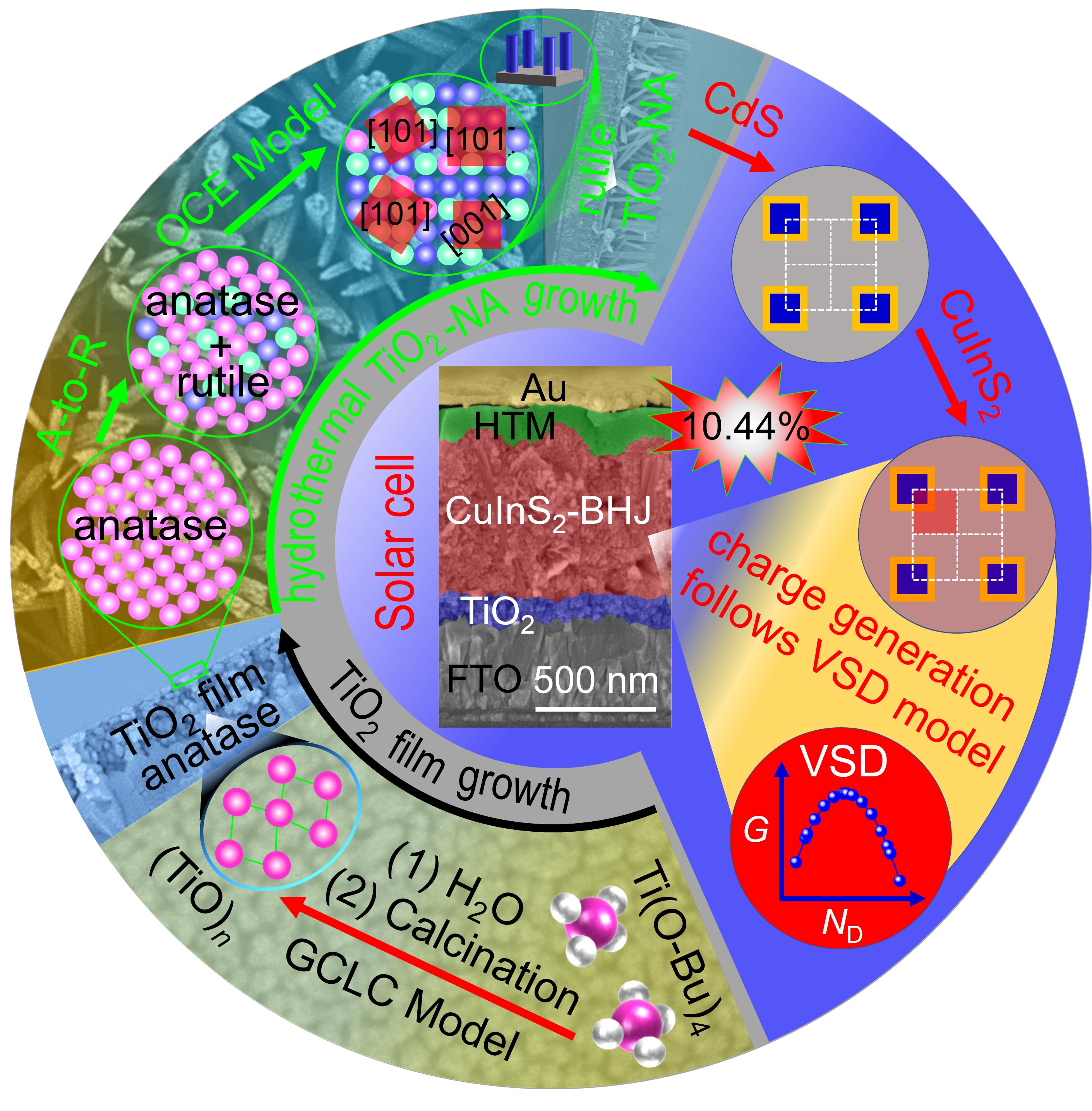 由于較大的銳鈦礦TiO2納米顆粒易發生原位A-to-R相變,TiO2-NA中ND可以通過tH得到有效調控。研究人員通過調控tH,結合一定的水熱反應條件,在不改變直徑和長度的情況下,實現了對TiO2-NA中的ND進行有效調控。進一步將ND調控的TiO2-NA用于構筑CuInS2太陽電池,提出了體積-面積-密度(VSD)多參數耦合模型,定量揭示了ND與光電流產生相關性的物理原理,首次在低溫條件制備了效率大于10%的CuInS2太陽電池,并創造了新的CuInS2太陽電池光電轉換效率記錄(10.44%)。該VSD多參數耦合模型為設計體型異質結結構光電器件提供了理論基礎。
