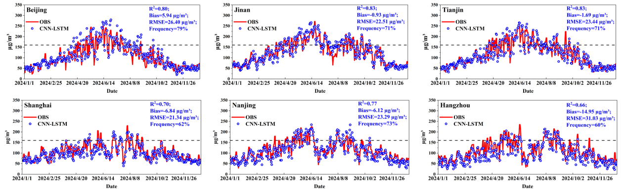 圖2:模型對于華北和長三角地區關鍵城市2024全年的臭氧預測性能,關鍵城市包括北京、濟南、天津、上海、南京和杭州。