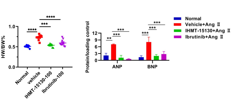 科研團(tuán)隊(duì)通過一系列體外及體內(nèi)實(shí)驗(yàn)發(fā)現(xiàn),化合物IHMT-15130可以有效抑制炎癥細(xì)胞因子分泌,阻斷炎癥相關(guān)信號(hào)通路,并且在血管緊張素Ⅱ(AngⅡ)誘導(dǎo)的小鼠心肌肥大模型中顯著減輕心肌肥厚程度。基于其效力和安全性,IHMT-15130不僅在治療心肌肥大方面具有潛在的應(yīng)用價(jià)值,還可以作為研究工具分子,深入解析BMX激酶在心血管疾病中的信號(hào)調(diào)控機(jī)制。