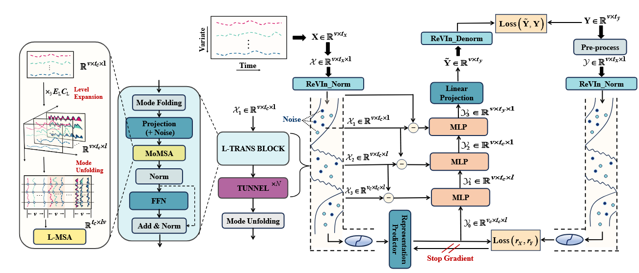 TimeCapsule是一種基于高維信息壓縮原則構建的模型,它在一個通用且簡化的框架內統一了這些技術。具體來說,它將時間序列建模為一個包含時間、變量和“水平層級”維度的高維信息載體,結合有損壓縮理論框架,利用張量模式乘積來捕獲多維度復雜依賴關系,同時實現維度壓縮的高效處理。另外,本工作還在壓縮表示域內提出了一種內部預測機制,并采用聯合嵌入預測架構對預測表示的學習過程進行監控。