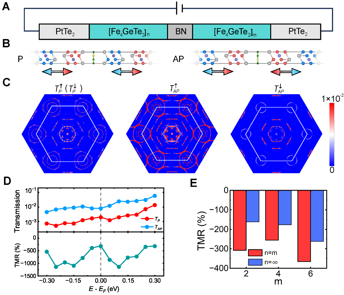 基于這一新機制,研究團隊提出了第三類反鐵磁隧道結的設計原則——通過界面效應而非體效應實現高效的自旋輸運(圖1(C))。研究人員構建了以二維范德華A型反鐵磁金屬Fe?GeTe?為電極、非磁絕緣體BN為勢壘的隧道結模型。量子輸運模擬結果顯示,即便電極材料本身具有自旋簡并的能帶結構,其界面仍能產生顯著的自旋極化電流(圖2)。更重要的是,該效應不受電極厚度或層數奇偶性影響,進一步證實其源于界面機制。
