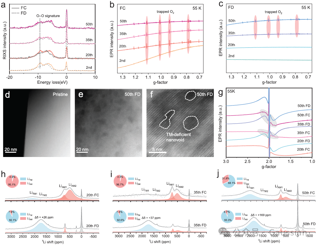 圖1.?循環過程中中間氧物種的演化及伴隨的結構重排。a) Na?.?Li?.??Mn?.??O?陰極在第2、20、35和50次循環的完全充電(FC)和完全放電(FD)狀態下收集的激發能量為531 eV的O K-edge RIXS光譜;b,c)?在55 K下收集的第2、20、35和50次循環的b) FC和c) FD狀態的X波段EPR光譜,g因子范圍為1.34–0.67(分子O?的范圍);d–f) 50次循環后Na?.?Li?.??Mn?.??O?的HAADF-STEM圖像,顯示Mn缺陷納米空隙的生成;g)?在55 K下收集的第20、35和50次循環的FC和FD狀態的X波段EPR光譜,g因子范圍為3.0–1.1(高自旋Mn??的范圍);h–j) Na?.?Li?.??Mn?.??O?陰極在h)?第20、i) 35和j) 50次循環的FC和FD狀態下收集的7Li pj-MATPASS NMR光譜的各向同性切片
