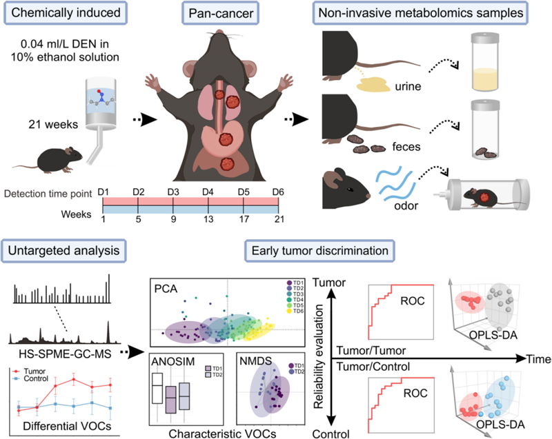 為了探索這一問題,研究團隊采取化學方法,誘導小鼠在肺、胃、肝、食道等器官形成多發腫瘤,并以此作為泛癌模型,與健康小鼠進行了對比實驗研究。在器官成瘤21周的6個時間節點,采集小鼠的尿液、糞便、氣味等三類代謝樣本,利用頂空-固相微萃取-氣相色譜-質譜(HS-SPME-GC-MS)技術,分別進行非靶向VOCs檢測分析。
