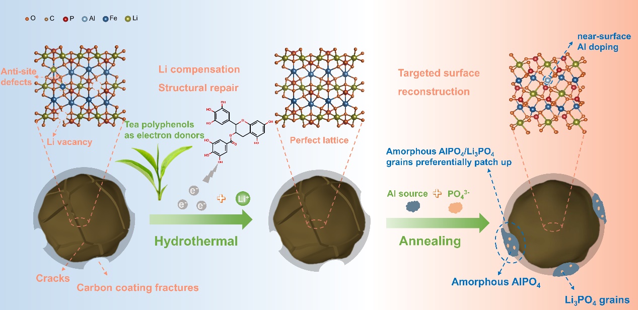 基于此,研究人員采用天然提取的茶多酚作為電子供體,利用其羥基電子供體與補充鋰鹽的共同作用,不僅將退役磷酸鐵鋰中衰退的FePO4相高效轉化為LiFePO4,還可以有效減少材料中的有害Li-Fe反位點缺陷,進而實現退役磷酸鐵鋰材料在成分和結構上的修復,并重建Li+的快速擴散通道。同時,針對退役磷酸鐵鋰材料顆粒表面碳層的破損缺失問題,與通常無選擇性地重新引入碳源構建新碳層的方法不同,研究人員通過在修復材料時引入Al源,利用磷酸鋁與磷酸鐵鋰優先結合的特性,精準地在碳層破損、磷酸鐵鋰裸漏處形成由非晶AlPO4和Li3PO4晶粒復合的定向填補涂層,實現對退役磷酸鐵鋰表面破損碳層的靶向修補;涂層中的非晶AlPO4和Li3PO4快離子導體還可與殘存的碳層在活性材料表面重構電子、離子雙快速傳輸通道,有利于提高再生后磷酸鐵鋰的倍率性能。此外,引入的部分Al元素還會摻雜到LiFePO4體相中,在不影響磷酸鐵鋰正極材料能量密度的前提下,提升了活性材料結構穩定性,有效抑制鐵離子再遷移,從而延長了磷酸鐵鋰正極的使用壽命。