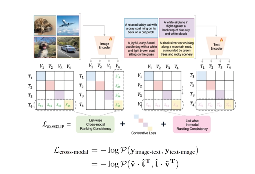 RANKCLIP的核心突破在于:受人腦不同感官皮層和聯合皮層跨模態聯合表征機制啟發,將訓練目標從Clip的“配對判斷”升級為“排序學習”,構建圖像與文本之間的全局排序分布,并通過最大化排序一致性似然來優化模型。該方法無需額外數據或計算資源,即可作為“即插即用”模塊融入現有CLIP系列模型,被大會程序委員會評價為“有望重新定義視覺-語言預訓練范式的突破性工作”。