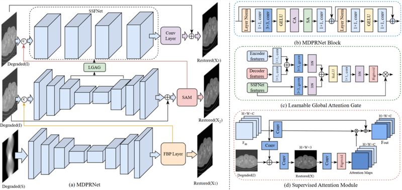 圖1.展示了用于稀疏視角CT重建的MDPRNet模型整體架構,采用多階段漸進式重建框架。早期階段使用U型網絡從正弦圖和CT圖像中提取多尺度特征,最終階段采用單尺度網絡(SSFNet)在原始分辨率下重建,以保留細節紋理。