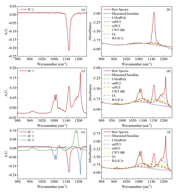 為減少混合氣體吸收峰重疊導致的基線校正誤差的影響,團隊研發了相對吸光度的獨立成分分析(RA-ICA)算法(李新春,Optics Express 2024)。通過計算相對吸光度光譜、提取獨立成分、重建隱藏基線,使得設備對混合氣體吸收峰重疊導致的基線校正誤差顯著低于常用方法,還能精準保留基線細節,滿足多氣體組分同時精確測量需求。該算法首先計算剔除基線信息的相對吸光度光譜,隨后結合比爾-朗伯定律與獨立成分分析,提取包含各組分吸收峰信息的獨立成分,對需基線校正的光譜進行擬合。最后采用多項式曲線與殘差相結合的基線模型,重建吸收波段的隱藏基線。仿真與實驗結果表明,RA-ICA方法重建的基線誤差顯著低于其他常用基線校正方法,且能準確保留基線的細節特征,能夠提供高質量的校正基線,滿足多氣體組分同時精確測量的需要。