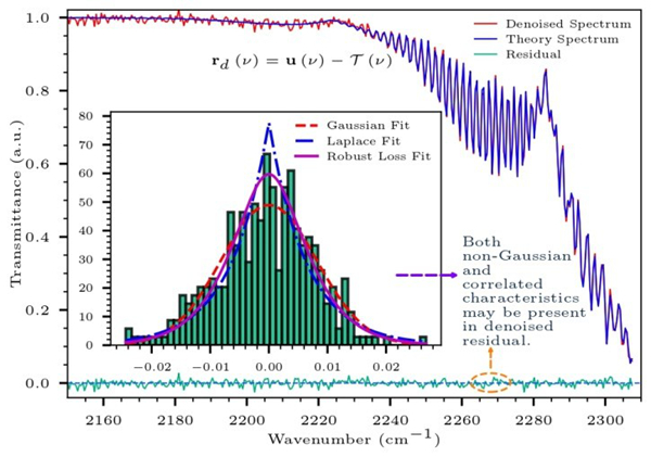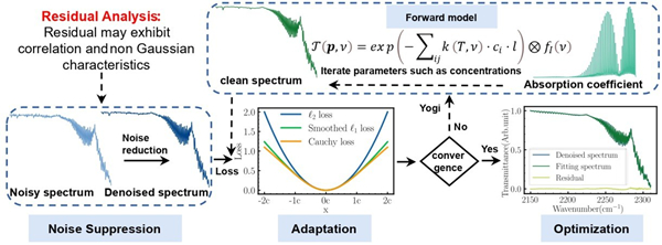 在實際濃度反演過程中,傳統最小二乘等方法受到噪聲和基線漂移等光譜干擾的影響,其氣體光譜定量結果準確性受限。為提升濃度反演精度,團隊提出了“抑制?-?適應?-?優化”模型,實現了光譜降噪、殘差建模以及損失優化的有機結合,為FTIR光譜的濃度反演提供了一種更具魯棒性的方法(王鈺豪,Optics Express 2025)。該模型融合光譜降噪、殘差建模與損失優化技術,能為工業監測、交通排放等場景的濃度反演提供魯棒方案。該算法首先通過噪聲抑制技術提高用于反演的光譜數據的質量,然后利用Ljung-Box檢驗和分位數-分位數圖等統計工具對降噪后光譜數據與前向模型的殘差分布進行分析,并采用Barron提出的廣義損失函數進行適應,最后采用Yogi優化器進行損失優化,實現氣體濃度反演。模擬和實驗光譜驗證了該模型在均方根誤差噪聲為1×10-3光譜數據集中的性能,相比于傳統方法,可以將CO2、N2O和CO的反演精密度提高15%。實驗結果表明,該方法在工業監測、環境研究以及交通排放等領域具有廣闊應用前景。