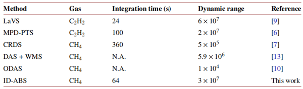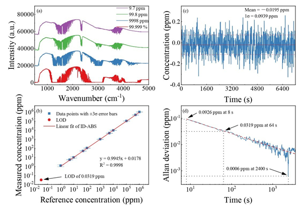 除此以外,FTIR光譜的寬帶多組分檢測能力,但分析波段的選擇影響定量準確性。為此,該團隊提出了一種基于信息密度的自適應波段優選(ID-ABS)方法(李新春,Optics Express 2025),以糾正高濃度下吸收飽和引發的光譜非線性響應、儀器分辨率限制以及基線重建誤差等問題。該模型整合譜線強度、吸收飽和特性、儀器線型函數及基線特征,動態評估全光譜信息密度分布,進而優選各組分反演參數,確定最優反演波段,最后通過非線性多元回歸迭代更新參數,直至收斂。實驗驗證表明,該方法對甲烷定量分析的線性動態范圍達到3×107(R2=0.9998)。ID-ABS?模型的適用性可拓展至其他具有紅外吸收特性的氣體,大幅提升了基于?FTIR?技術對復雜多組分混合物的定量分析能力。