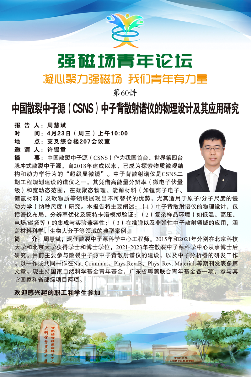 【4.23】學術報告:中國散裂中子源(CSNS)中子背散射譜儀的物理設計及其應用研究