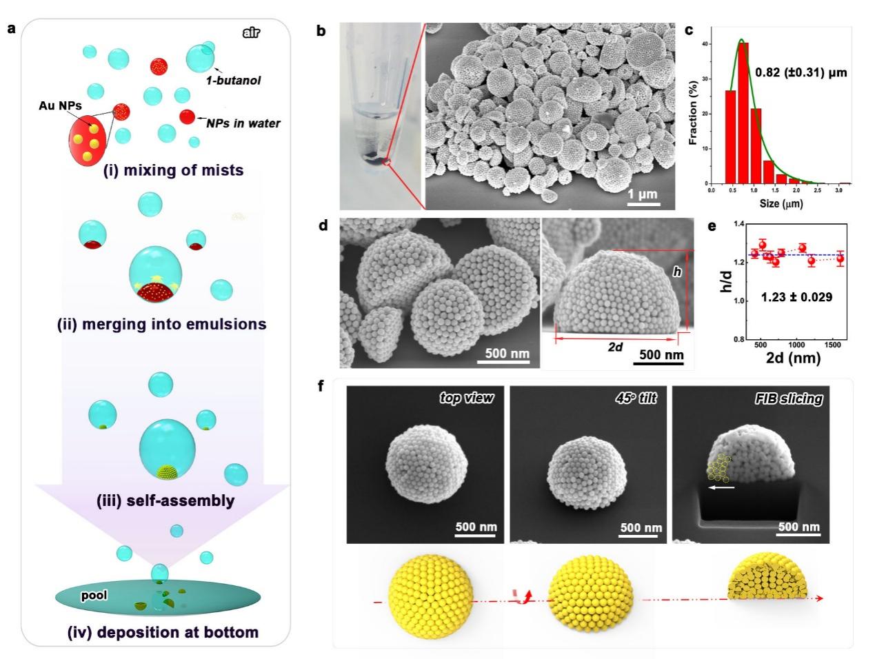 圖1. (a) 瞬態(tài)乳液氣溶膠體系構(gòu)建及自組裝示意圖;(b-f)半球形超結(jié)構(gòu)形貌表征。