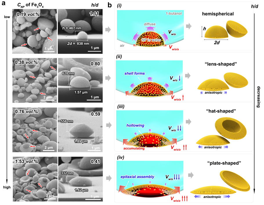 研究團(tuán)隊(duì)進(jìn)一步深入揭示了該體系的自組裝機(jī)制:水相因密度差異沉降于正丁醇液滴底部,形成動(dòng)態(tài)不對稱界面;隨后,納米粒子在快速擴(kuò)散的兩相界面處自發(fā)富集,通過溶劑的不對稱輸運(yùn)(水向外擴(kuò)散速率顯著快于正向醇向內(nèi)擴(kuò)散)引發(fā)類似金屬擴(kuò)散中的“柯肯達(dá)爾效應(yīng)”,導(dǎo)致超結(jié)構(gòu)內(nèi)部發(fā)生選擇性空腔化;最終,形成不對稱半球型、中空或多級的復(fù)雜超結(jié)構(gòu)(圖2)。