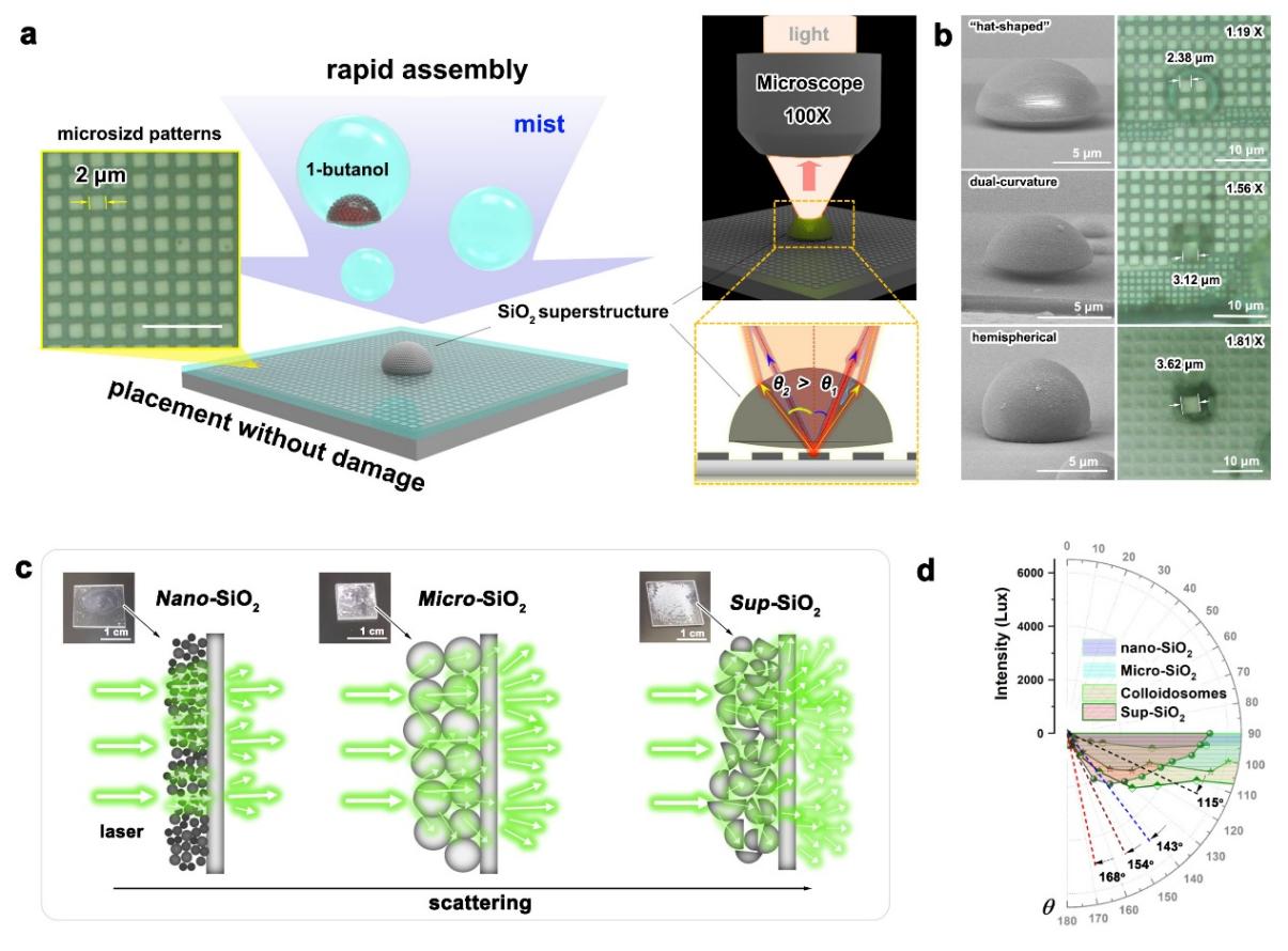 基于這項(xiàng)技術(shù),研究團(tuán)隊(duì)成功制備出具有放大倍數(shù)可調(diào)的二氧化硅微透鏡超結(jié)構(gòu)(圖3a-3b)。這種新型微透鏡可顯著提升光通量數(shù)值孔徑,有望突破傳統(tǒng)光學(xué)顯微鏡的分辨率極限;且其獨(dú)特的可移除特性,使其在珍貴生物樣本觀測等特殊場景中展現(xiàn)出獨(dú)特優(yōu)勢。此外,該瞬態(tài)乳液氣溶膠展現(xiàn)出的連續(xù)自組裝能力,可直接在基底表面構(gòu)建富含復(fù)雜微米級凹凸結(jié)構(gòu)的涂層(圖3c-3d)。這些涂層展現(xiàn)出優(yōu)異的光擴(kuò)散性能(低霧度、高亮度),在微型發(fā)光二極管顯示、光學(xué)器件等領(lǐng)域具有廣闊應(yīng)用價(jià)值。