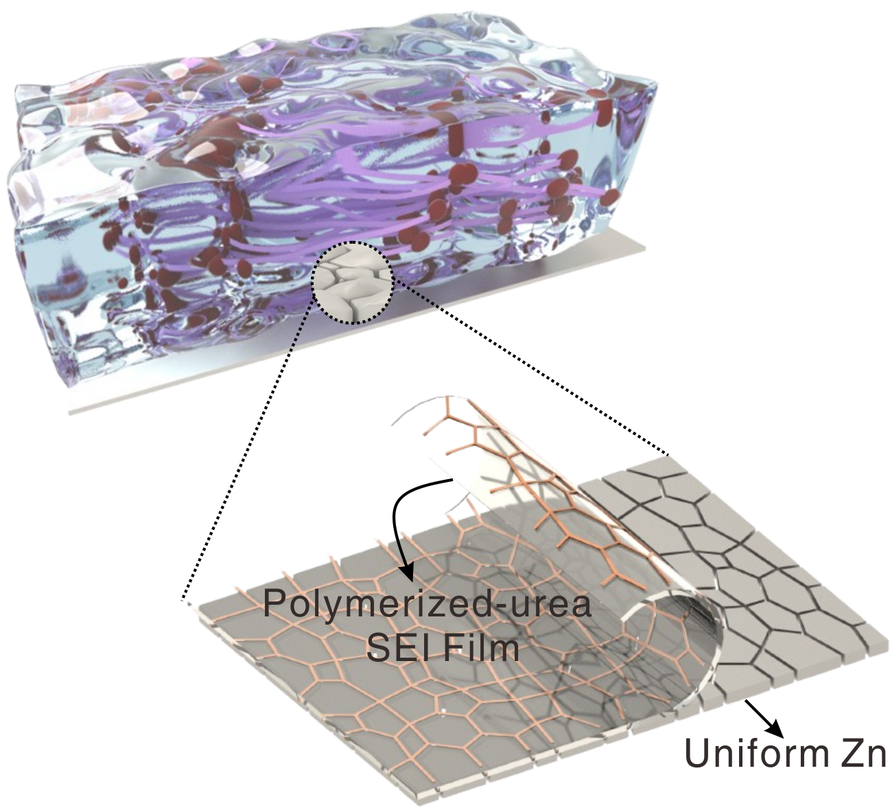 該研究突破了傳統(tǒng)的液態(tài)醋酸鋅電解液濃度限值,利用親鋅增溶劑構(gòu)建高濃度醋酸鋅凝膠電解質(zhì),有效穩(wěn)定活性水分子并提升了凝膠電解質(zhì)的機械韌性和抗疲勞性能。同時,構(gòu)建了原位聚脲SEI層,增強了電極/電解質(zhì)界面的熱力學(xué)穩(wěn)定性,突顯了其在便攜式和可穿戴電子設(shè)備中的應(yīng)用潛力。