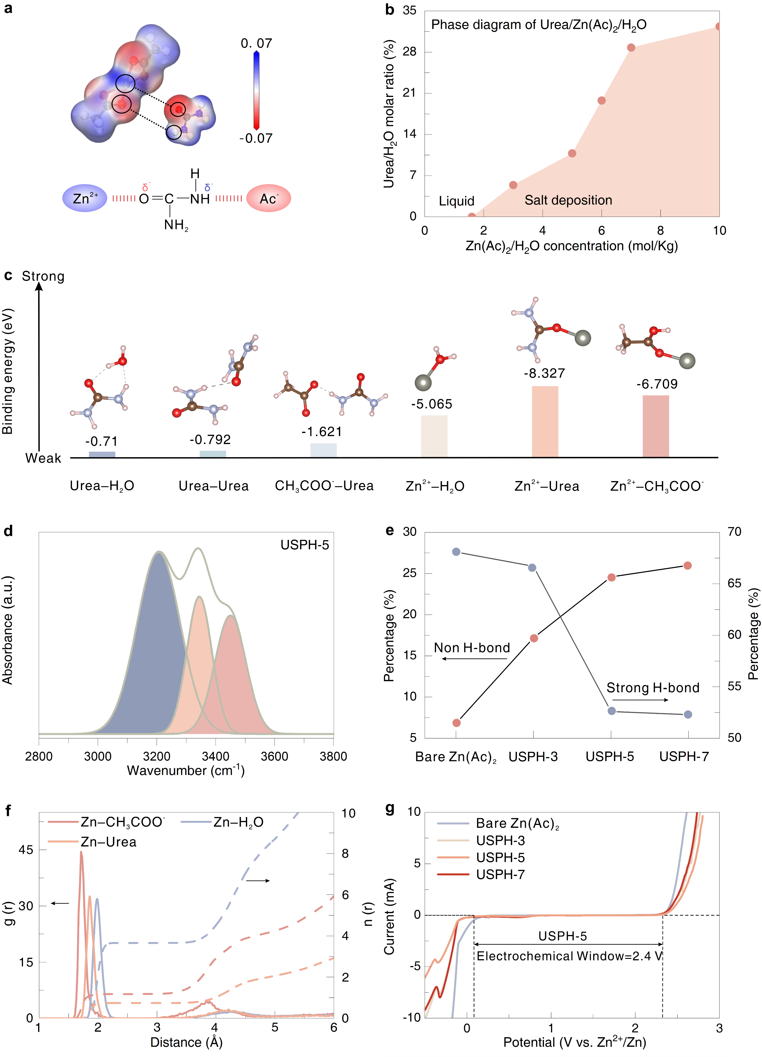 圖2. (a) Zn(Ac)?和尿素的靜電勢(ESP)分布,以及Zn2?-尿素-Ac?間相互作用的示意圖;(b) 尿素/Zn(Ac)?/H?O的相圖;(c) 電解質(zhì)中不同物種間的結(jié)合能;(d) USPH-5電解質(zhì)在O-H伸縮區(qū)域擬合后的傅里葉變換紅外光譜(FTIR);(e) 電解質(zhì)中強氫鍵和非氫鍵的比例;(f) 從USPH-5電解質(zhì)的分子動力學(xué)模擬(MD)中收集的Zn2?-Ac?、Zn2?-尿素和Zn2?-H?O的徑向分布函數(shù)(RDF);(g) 各種電解質(zhì)的電化學(xué)窗口。