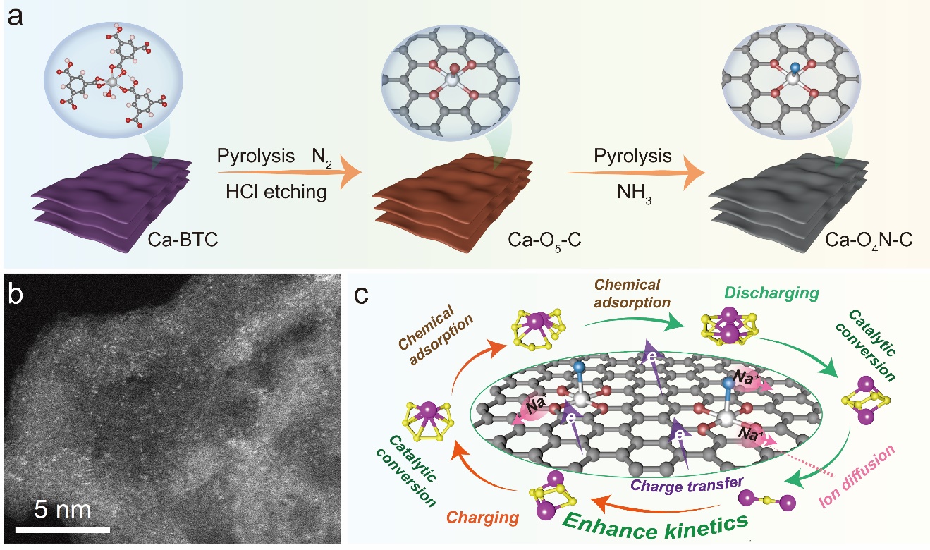 圖1. Ca單原子催化劑的合成示意圖、結構表征及鈉硫電池反應機理圖。
