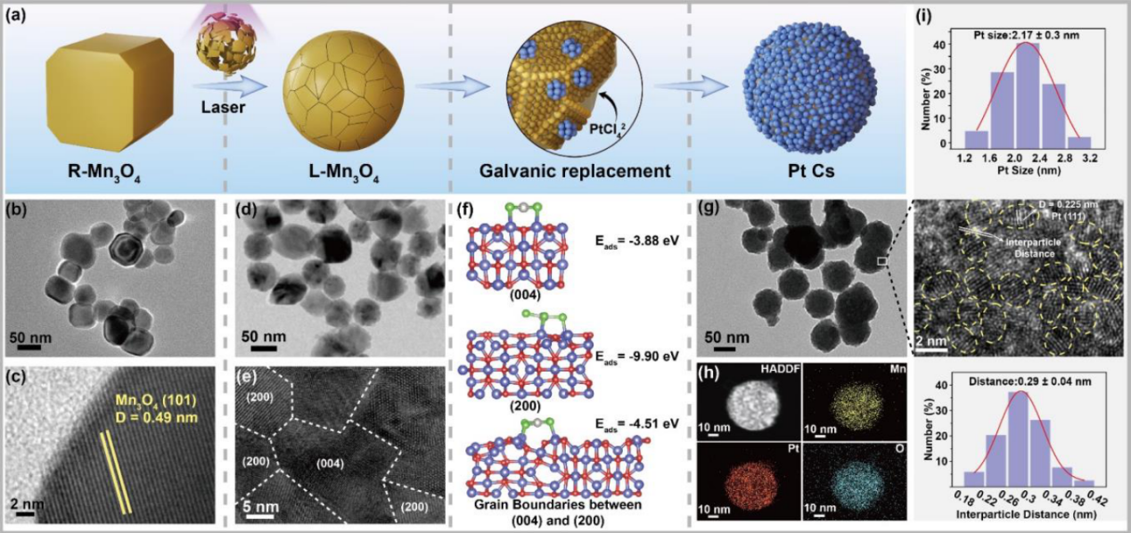 基于此,研究人員通過脈沖激光輻照獲得富含晶界(GBs)的 Mn3O4 納米顆粒,并將其作為理想的納米支架,與 Pt 離子進行電偶置換反應,最終得到由尺寸為 2.2 納米 的超小Pt顆粒組成的膠體球,顆粒間距僅為 0.3 納米。光輔助的類酶催化測試結果表明,Pt Cs通過近紅外光激發 d 帶電子迅速產生熱電子,并用于催化分解不同的酶底物分子,這為驗證近紅外光增強Pt催化過程的電子機制提供了確鑿證據。與分散的超小 Pt 納米顆粒相比,Pt 納米膠體球表現出卓越的類過氧化氫酶(CAT)和類氧化酶(OXD)催化能力。